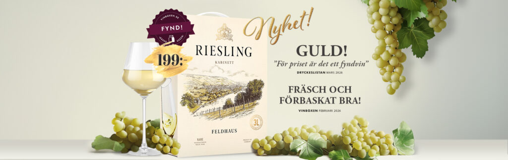 Nyhet! Sveriges bäst prisade Riesling Kabinett – 3 liter för 199 kr! Nu är det premiär för Feldhaus Riesling Kabinett,